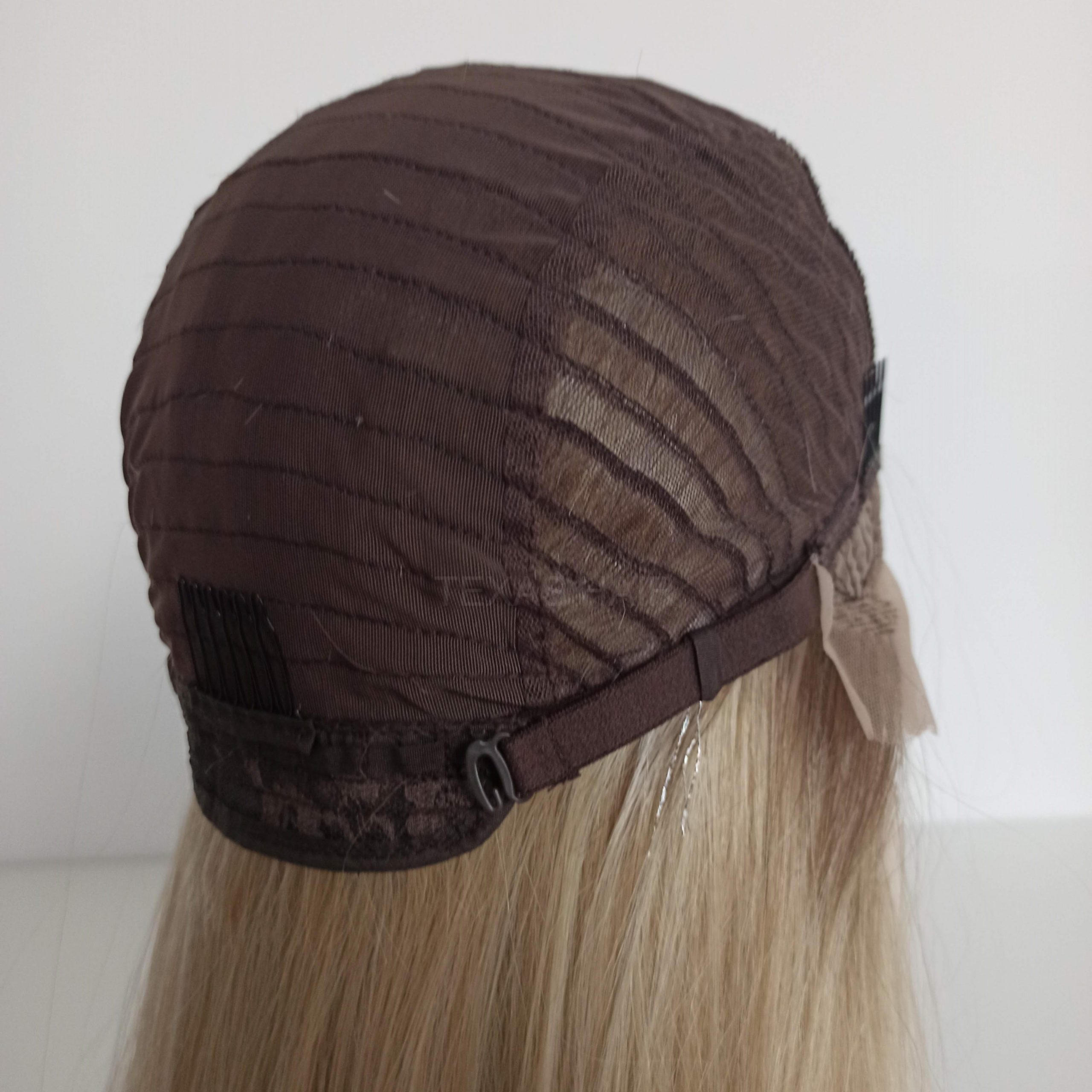 Wewnątrz peruki przymocowany jest pasek umożliwiający regulację obwodu, dzięki czemu peruka idealnie dopasowuje się do każdej głowy. Posiada również wsuwki umożliwiające spasowanie peruki z swoimi włosami.