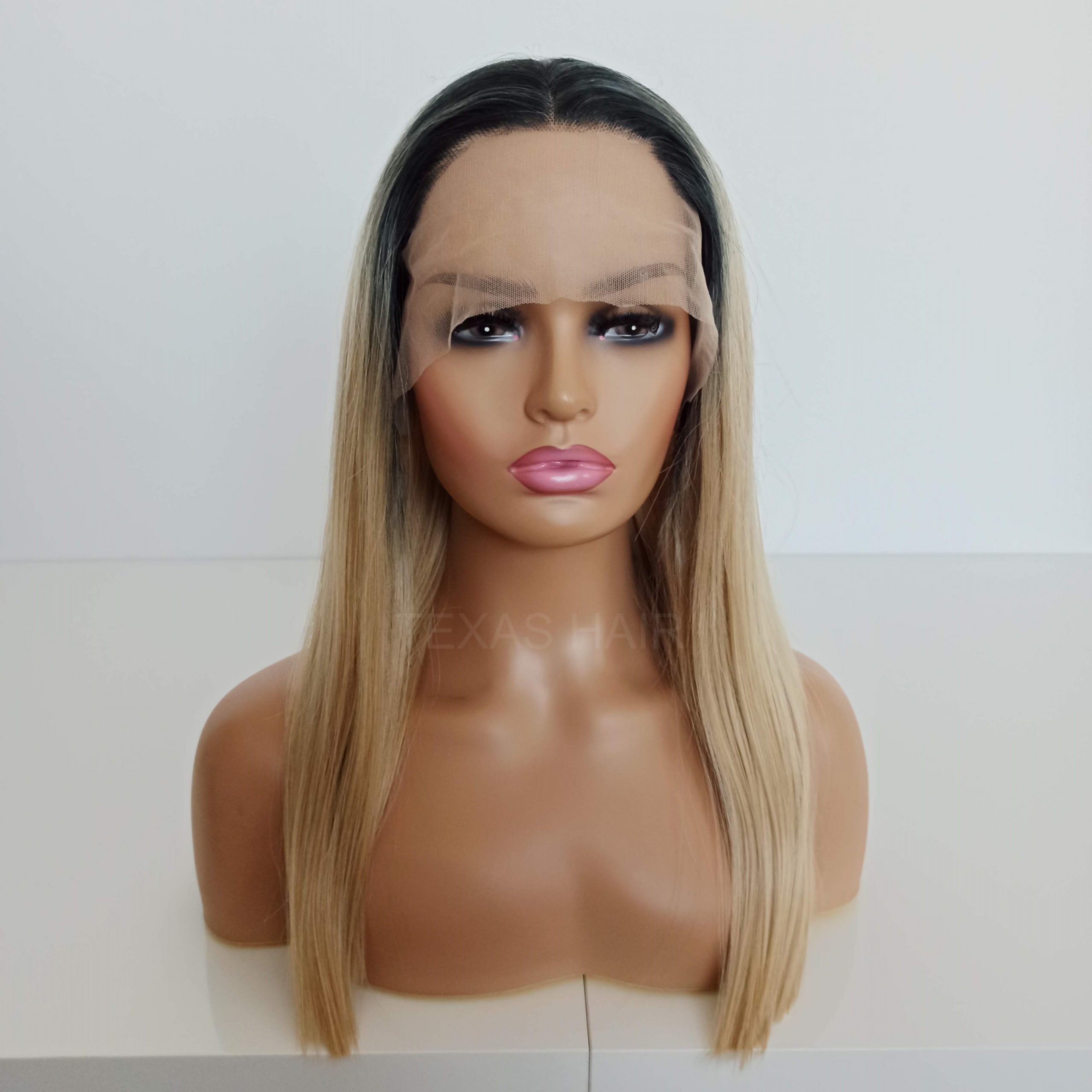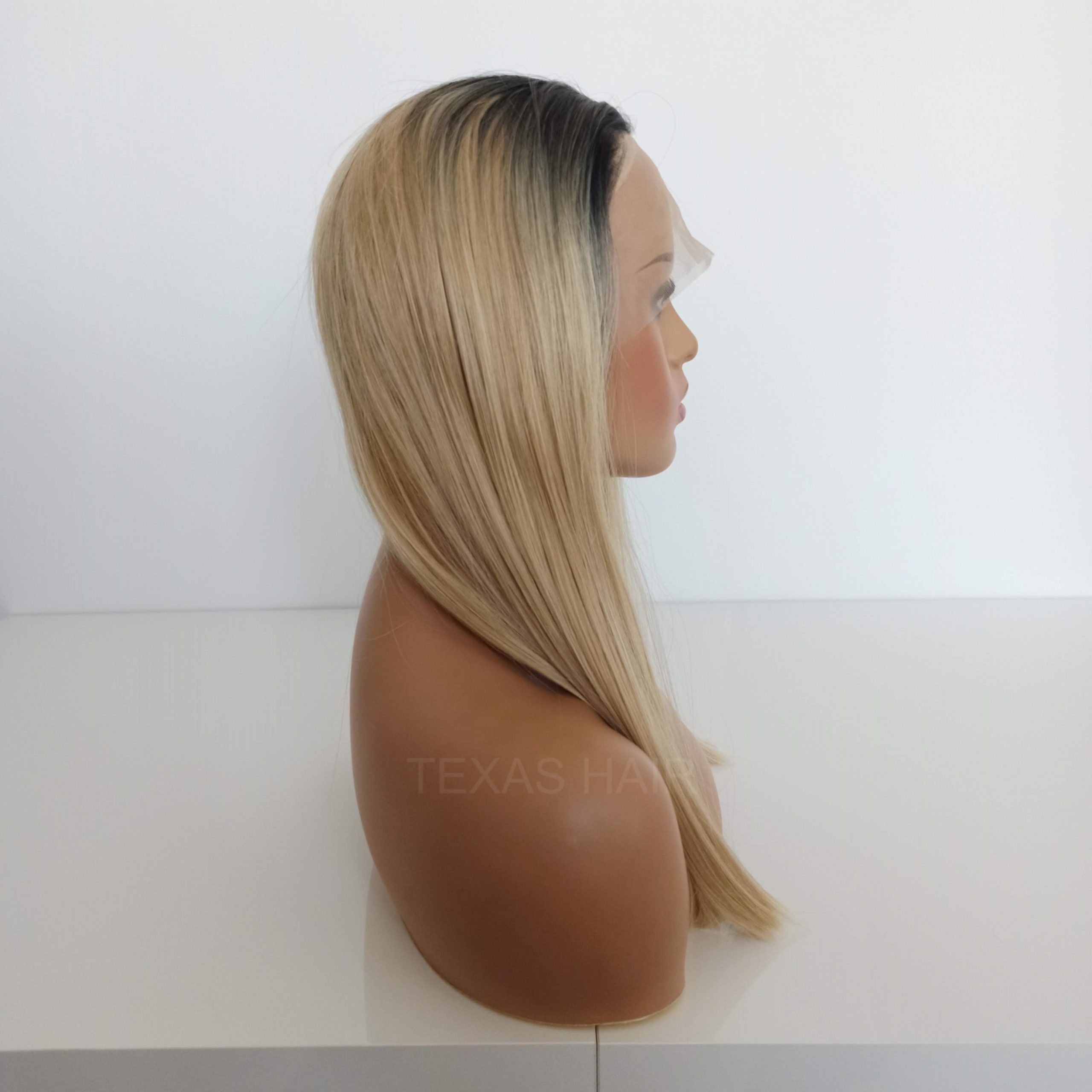 Peruka Lace Front w kolorze blondu z ciemnym odrostem o długości 55-60 cm